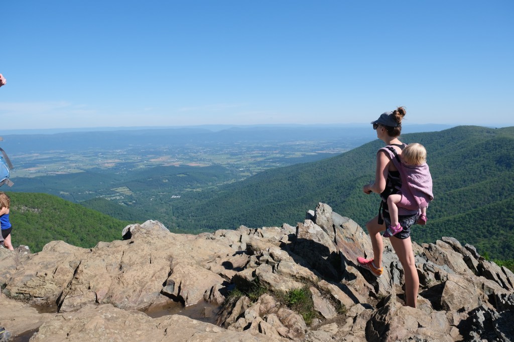 We chose Hawksbill Summit – the lower trail. With an elevation of 4,050, it is the highest point in the Shenandoah National Park. It was 1.8 miles round trip – all uphill and very rocky. Our five year old did the whole trail herself, and I carried our youngest in the carrier. We brought our dog and he was beyond excited (please keep your dogs leashed – at the summit someone had their dog off leash and ran up to ours which was very dangerous, as there are cliffs).