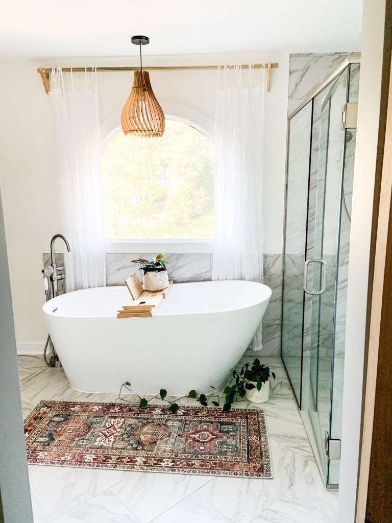Chandelier over the tub is from Knock on Wood Creations on Etsy – handmade in Georgia! Sal is an amazing artist and you put together the shade yourself (a fun task my kids helped with). Best part? The fresh wood smell!