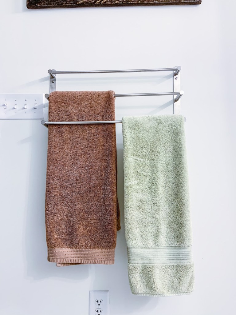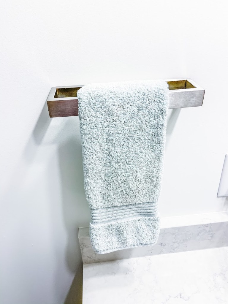 Modern hand towel holders in stainless steel can be found here. Three tier towel rack can be found here – most dual towel racks were too close to each other and the towels never dried, so three did the trick! Though down the road I might get a heated towel rack 🙂