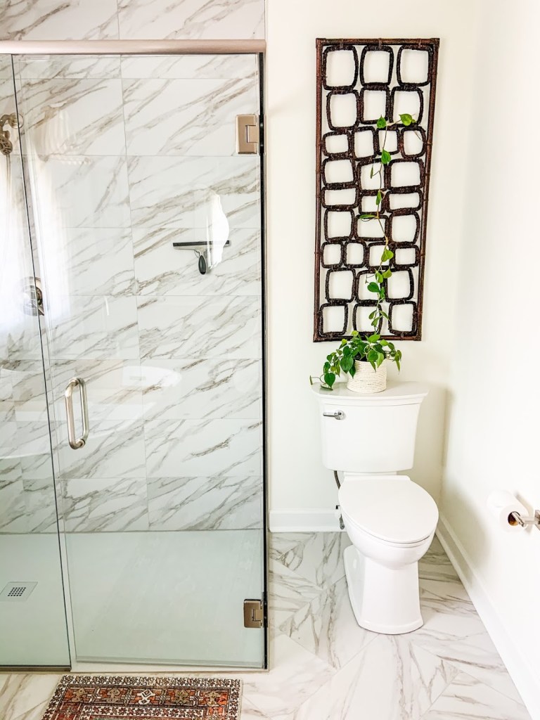 I chose a matte marble pattern tile for the floors and shower. I like big tile and I cannot lie! Why, you ask? LESS GROUT! There I said it, I have a very strong dislike for grout! Cleaning it is horrible, and I wanted as little as possible. The herringbone pattern for the floor distinguished it from the shower, and it turned out beautifully.