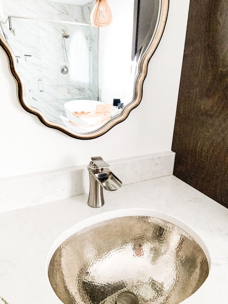 I love the way our hammered nickel sinks turned out. I really wanted something other than a plain white sink, and they delivered! Find them here.