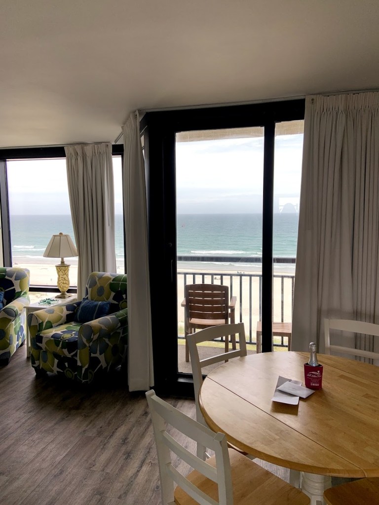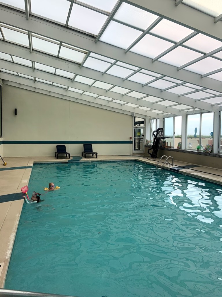 Now that we have established the location is ideal, let’s talk about the resort itself. There is both an indoor and outdoor pool, with a hot tub at the outdoor pool. The beach is literally steps away and not crowded (we were there in peak season). I appreciated that there was a life guard stationed on this beach directly in front of the hotel. The staff is kind and accommodating, and the other guests felt like old friends. There is a restaurant on-site where we ate a delicious breakfast (try the French toast, yum!) with a view of the ocean.