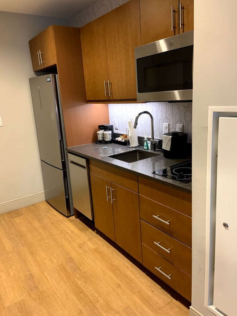 Each room has its own kitchen with full size refrigerator and cooktop (huge bonus when traveling with kids). They also have free buffet breakfast which had many options. We had a view of the river from our room, and they offer pet friendly rooms. It is only 20 minutes from the Philadelphia airport as well.
