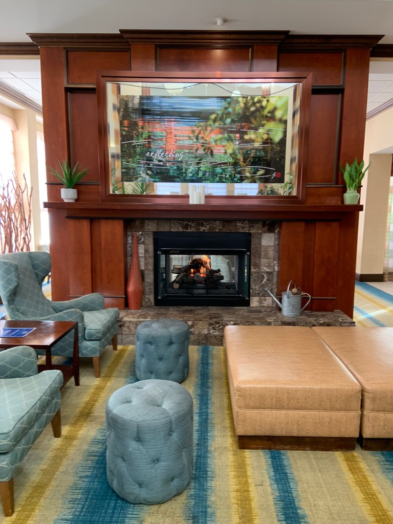 Our room was a standard two queen bedroom with a refrigerator (so happy when hotels still have these). The bathroom also has a tub which id great for the little ones. The staff at the hotel were very kind and gave me several suggestions on things to do in the area (you can tell they are proud of their city). The lobby and breakfast area look recently renovated and modern – we loved the fireplace upon entering, it felt very cozy.