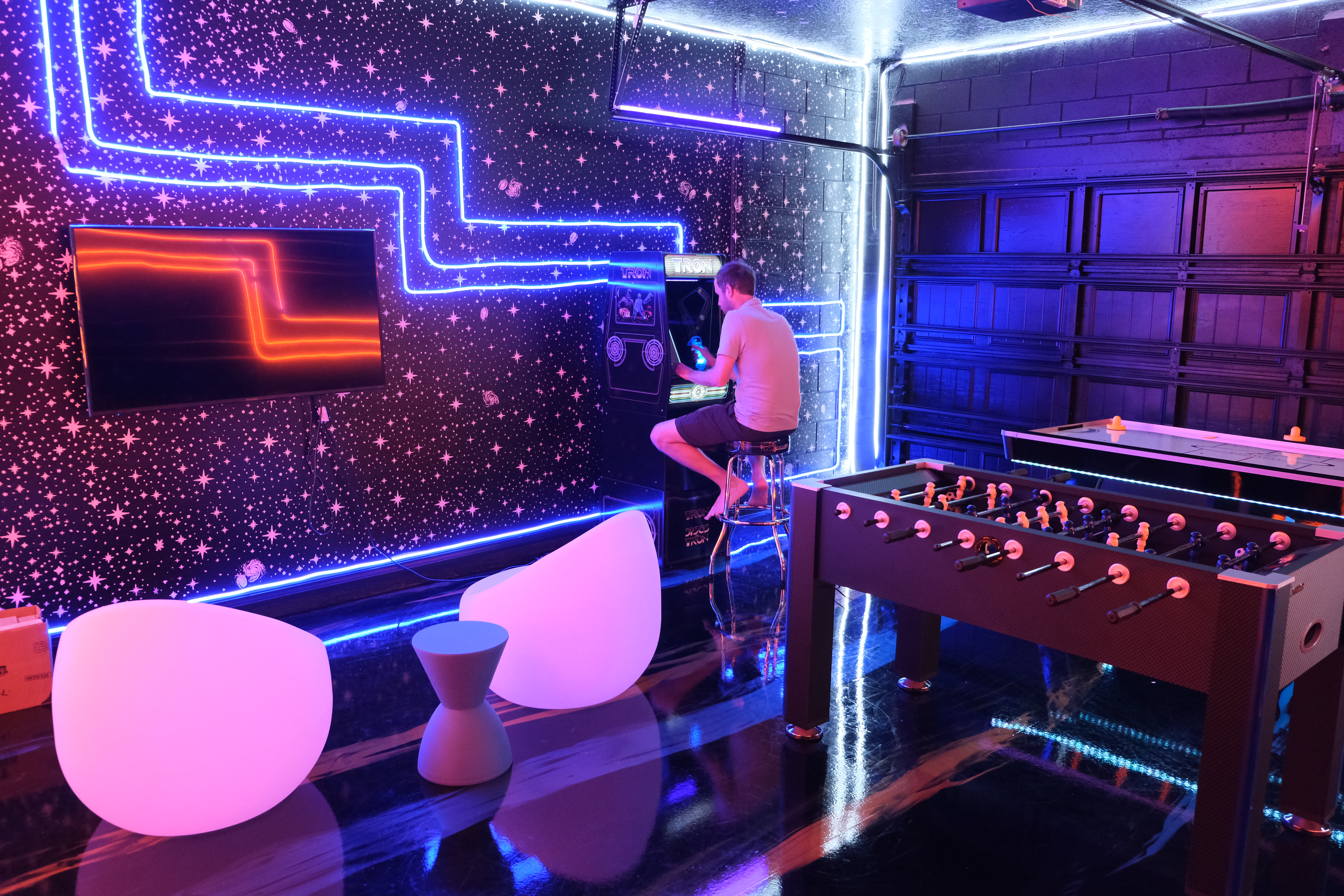 And last but not least, the “garage”. I say “garage” with quotes because it has, in fact, been converted to the most incredible game room I have ever seen at a house. This Tron game room has skee-ball, air hockey, Tron arcade game, foosball, giant jenga, and a tv! It is where my kids spent any spare time out of the pool, and where my husband could be found. The detail that went into the design will blow you away – and you will find yourself daydreaming about transforming your own garage at home.