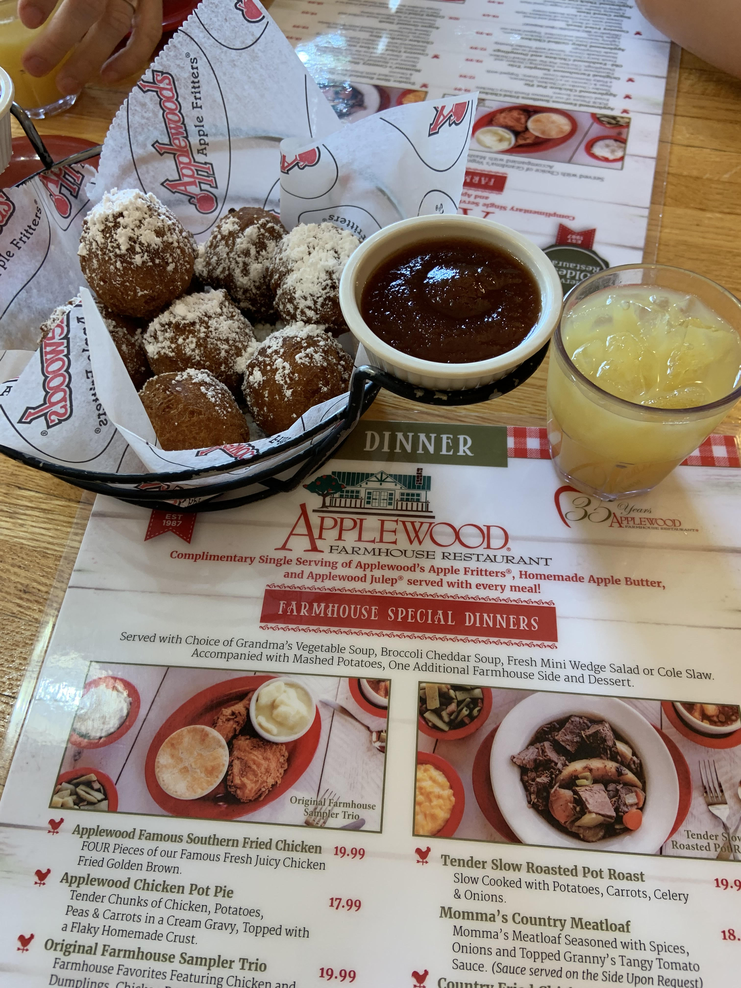 Applewood Farmhouse Restaurant – Applewood Farmhouse Restaurant is a staple when visiting Sevierville for hearty Southern comfort food. After sitting down you are treated to apple fritters with apple butter and an apple julep. I am still dreaming about those apple fritters. Next, time to order! You cannot go wrong with this menu, everything is cooked to perfection. I could not make up my mind, so I went with the sampler and tried it all! Every meal is served with soup or salad, two farmhouse sides, and dessert. Believe me, when I say bring your appetite, I mean it! The service is second to none, and you will truly feel like part of the family.