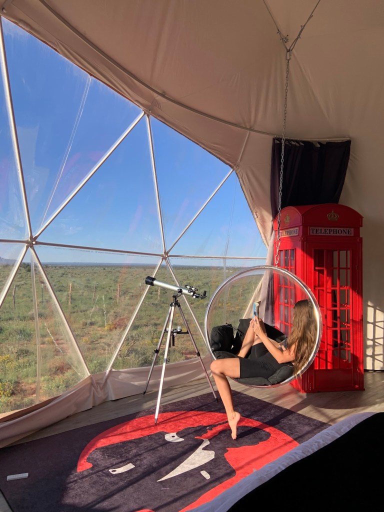 Each sky dome has a telescope, full bathroom, a retractable ceiling to see the stars, a clear front dome to see outside with blackout curtains when not in use, there was a queen bed downstairs, and a double bed and single bed on the second floor, and an air-condition/heat unit.